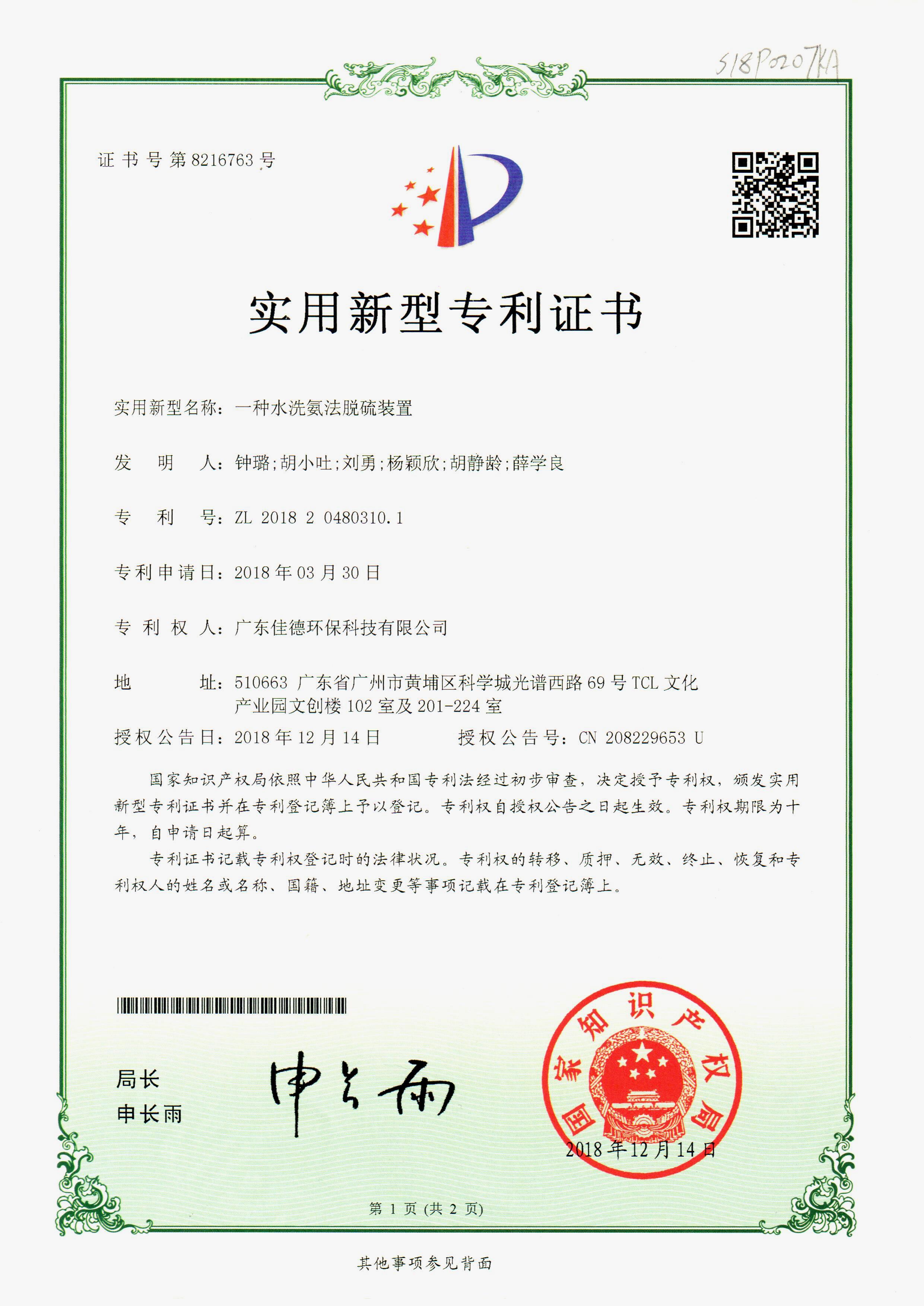 一種水洗氨法脫硫裝置(ZL201820480310.1)