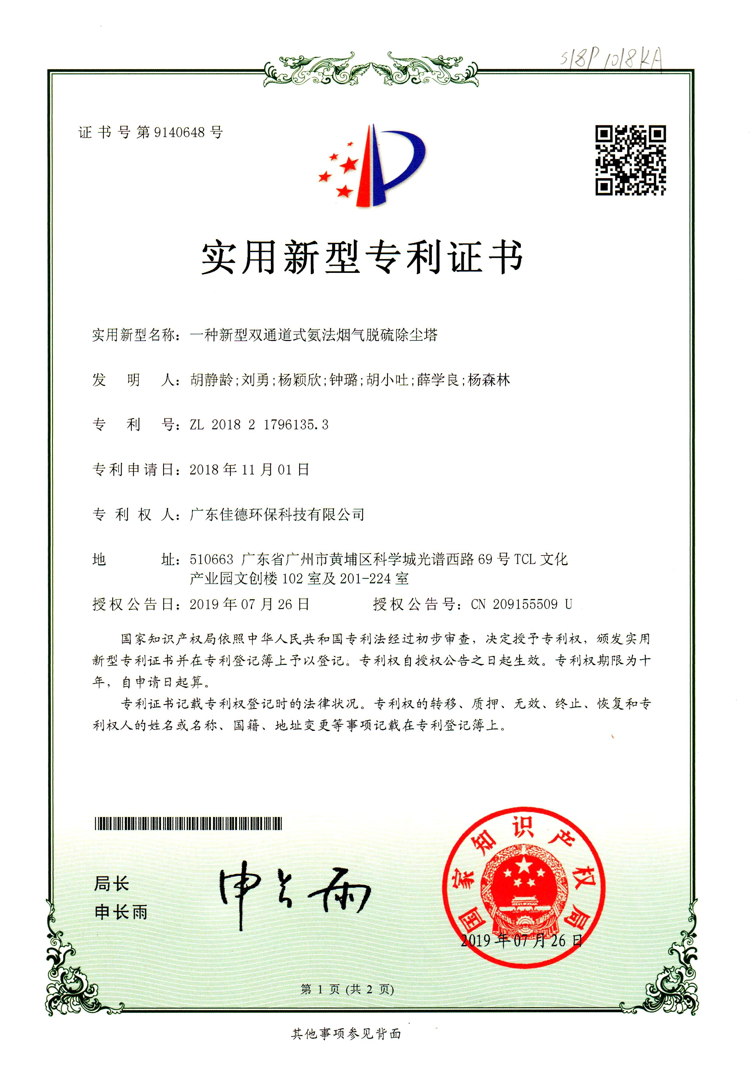 一種新型雙通道式氨法煙氣脫硫除塵塔(ZL201821796135....