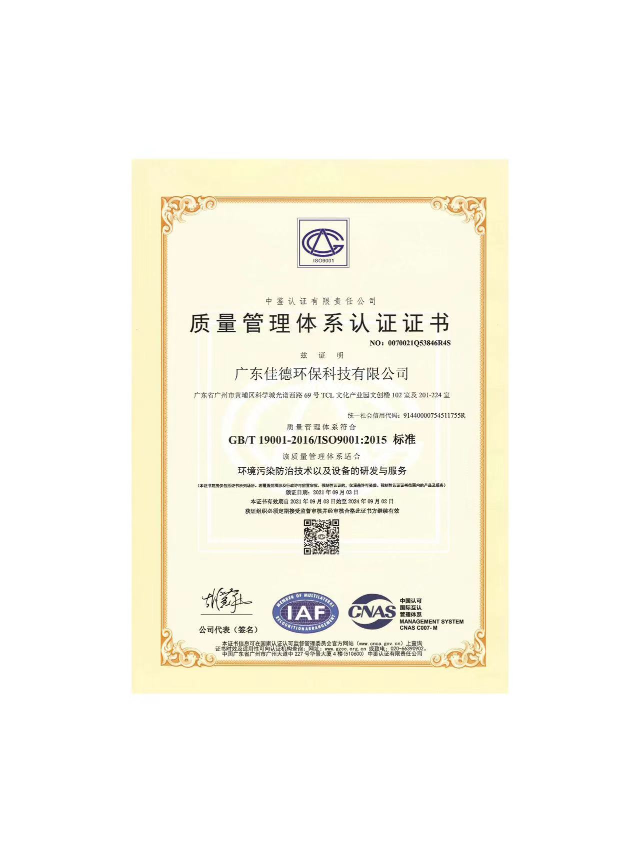 質(zhì)量管理體系認(rèn)證證書