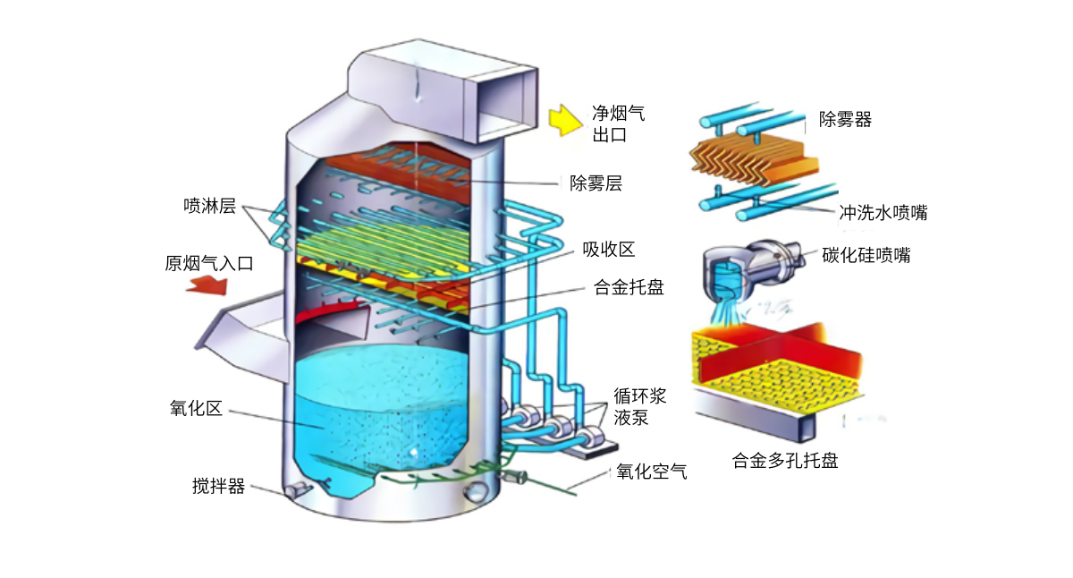 將石灰石 / 石灰粉加水制成漿液作為吸收劑注入吸收塔與煙氣充分混合接觸,煙氣中的二氧化硫與漿液中的碳酸鈣 / 石灰反應(yīng),經(jīng)鼓入空氣氧化生成硫酸鈣,達(dá)到一定飽和度后,結(jié)晶形成二水石膏。石膏漿液經(jīng)濃縮、脫水后用送至石膏貯倉(cāng),脫硫后的煙氣經(jīng)過(guò)除霧器除去霧滴,再經(jīng)過(guò)濕電除塵器后達(dá)到超低排放要求,由煙囪排放。